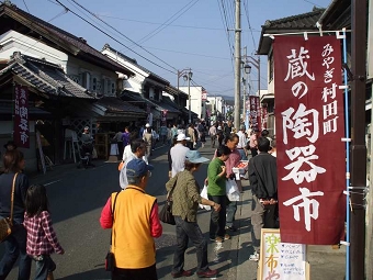 みやぎ村田町蔵の陶器市は、江戸末期紅花で栄え、当時の栄華を伝える豪勢な店蔵が、現在では空き店舗となり、その店蔵を現代に活かして賑やかせたいという町有志の働きかけにより始まりました。現在使用している店蔵・空き店舗は、ほとんどが私有地で、所有者のご理解・ご協力のもと借用しております。